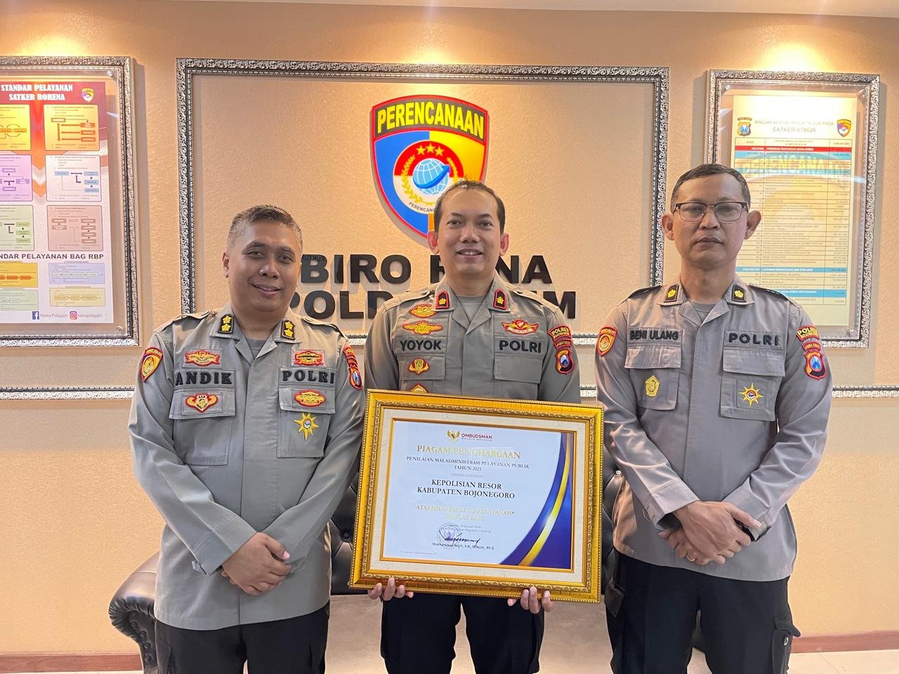Penghargaan tersebut diserahkan langsung oleh Ombudsman RI Perwakilan Jawa Timur, Triyoga Muhtar Habibi, dan diterima oleh Wakapolres Bojonegoro Kompol Yoyok Dwi Purnomo. Penyerahan berlangsung di ruang rapat Biro Perencanaan Polda Jawa Timur pada Selasa (7/4/2026).